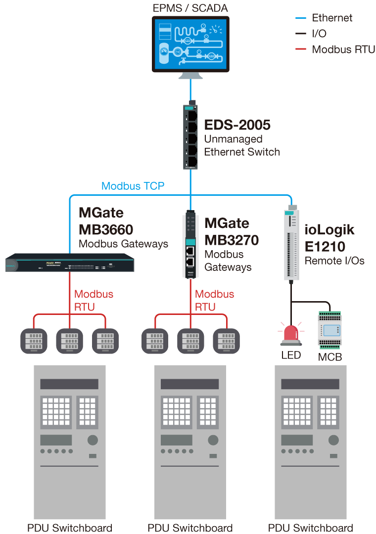 To support efficient monitoring and management of Power Distribution Units (PDUs), Moxa provides a complete connectivity solution that enables seamless data integration from PDUs and Static Transfer Switches (STS) to EPMS and SCADA systems.